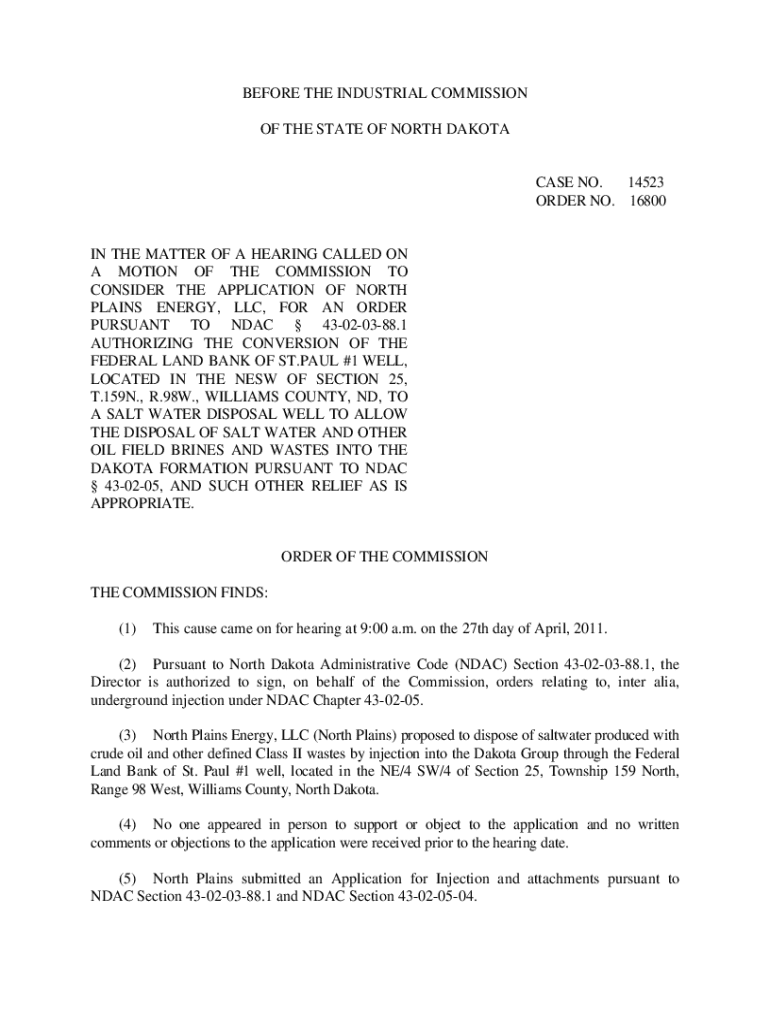 This document is an application to the North Dakota Industrial Commission from North Plains Energy, LLC for the conversion of the Federal Land Bank of St. Paul #1 well to a salt water disposal well.
