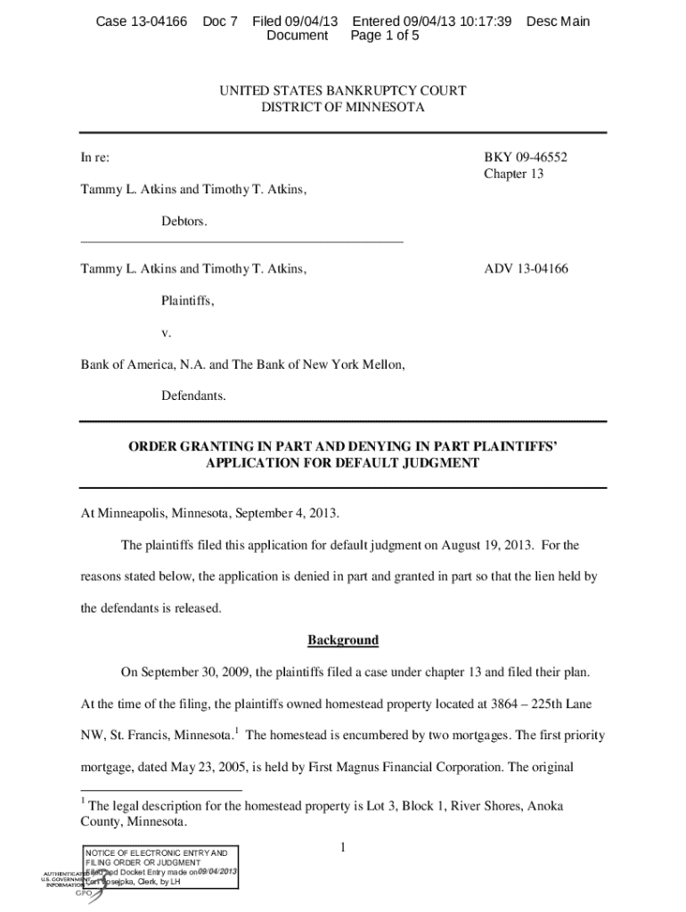 Case 1304166Doc 7Filed 09/04/13 Entered 09/04/13 10:17:39 Document Page 1 of 5Desc MainUNITED STATES BANKRUPTCY COURT DISTRICT OF MINNESOTAIn re:BKY 0946552 Chapter 13Tammy L. Atkins and Timothy T.