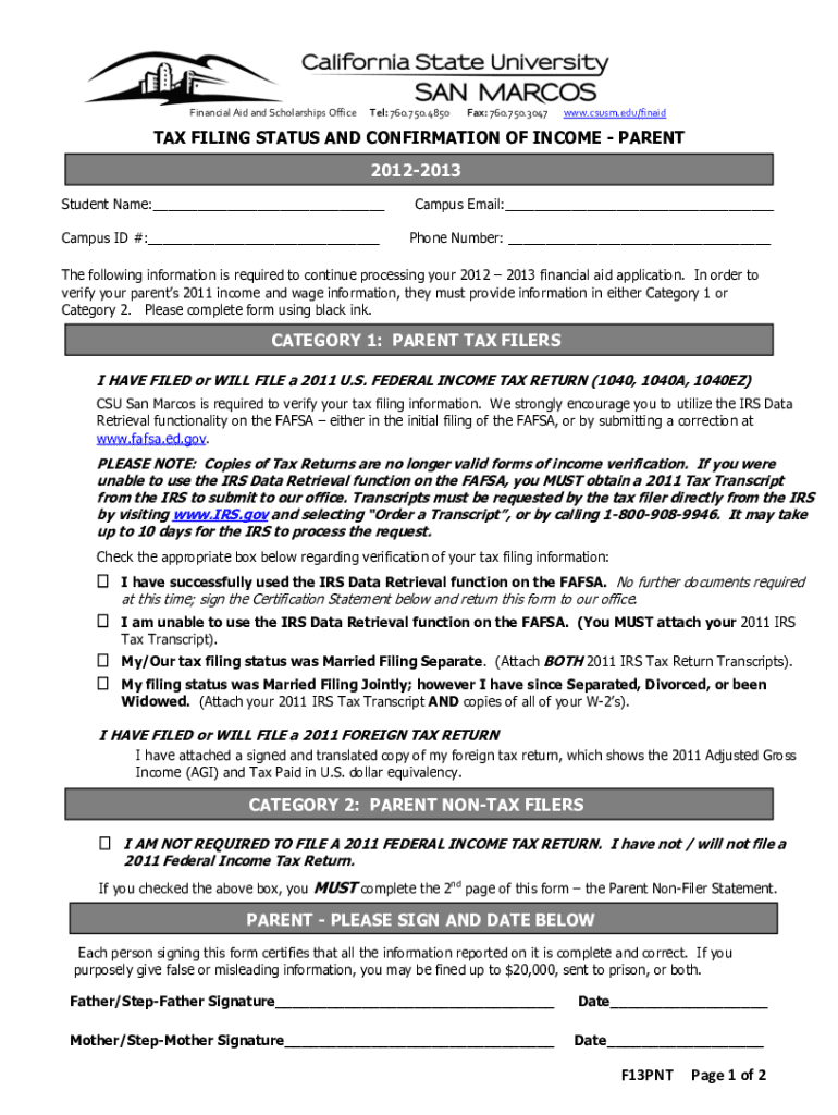 This form is required for the verification of a parent\'s income and wage information for the 2012-2013 financial aid application. Parents must provide information regarding their tax filing status,