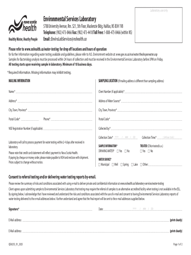 Laboratory use onlyEnvironmental Services Laboratory Healthy Water, Heathy People5788 University Avenue, Rm. 521, 5th Floor, Mackenzie Bldg. Halifax, NS B3H 1V8 Telephone: (902) 4738466 Fax: (902)