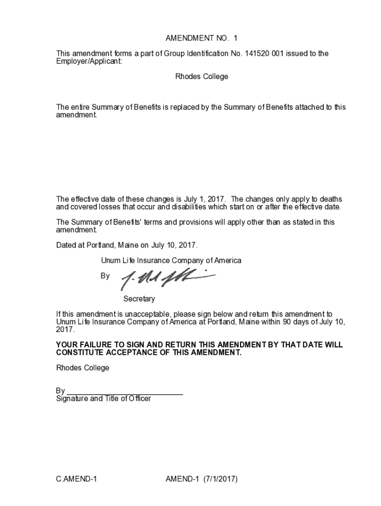 This amendment modifies the Group Identification No. 141520 001 issued to Rhodes College, replacing the entire Summary of Benefits with the terms of this amendment effective July 1, 2017. It details