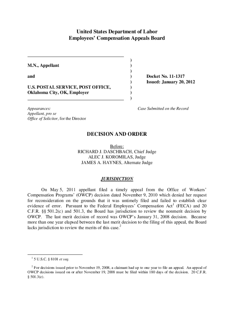 United States Department of Labor Employees Compensation Appeals Board ___ M.N., Appellant and U.S. POSTAL SERVICE, POST OFFICE, Oklahoma City, OK, Employer ___) ) ) ) ) ) ) )Appearances: Appellant,