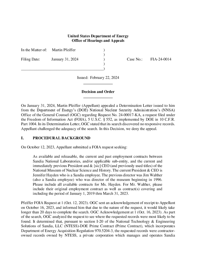 United States Department of Energy Office of Hearings and Appeals In the Matter of:Martin Pfeiffer) ) Filing Date: January 31, 2024 ) ) ___)Case No.:FIA240014Issued: February 22, 2024 ___ Decision