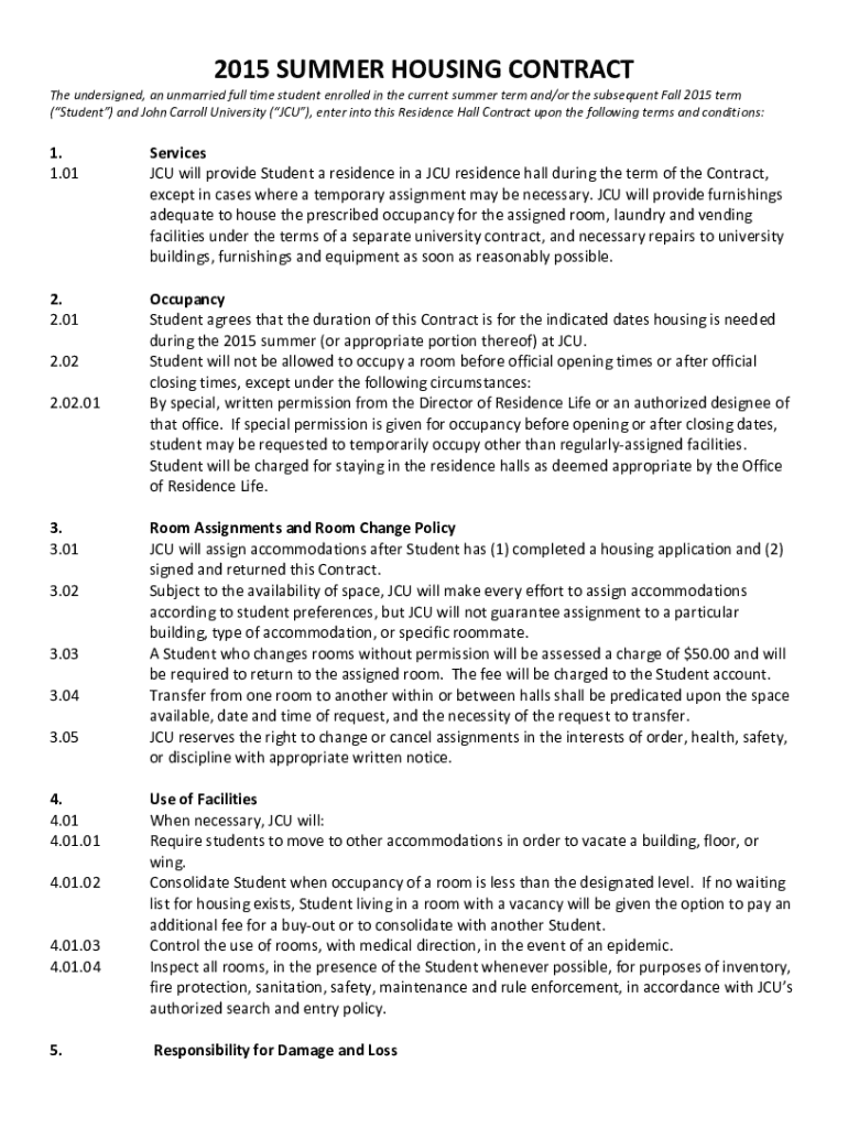 This contract outlines the terms and conditions for unmarried full-time students at John Carroll University (JCU) to obtain housing in residence halls during the summer term of 2015. It includes provisions