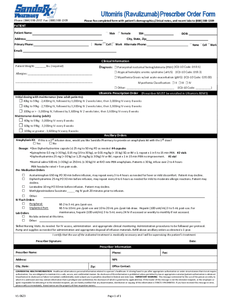 The ultomiris prescriber order form must report information such as patient demographics, medical history related to the conditions being treated, specific dosage and administration instructions, and any other pertinent clinical information.