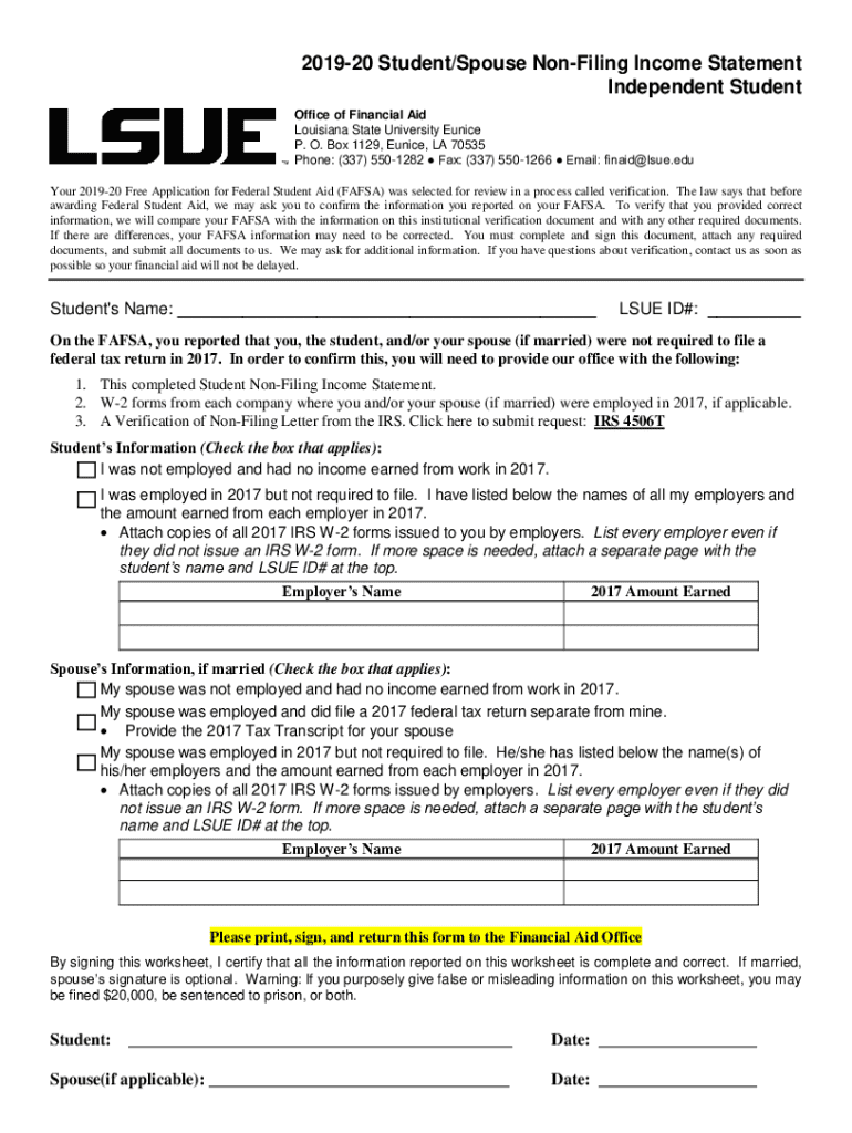This document is required for independent students at Louisiana State University Eunice to verify their non-filing status for the 2019-20 FAFSA. Students must complete the form, provide information