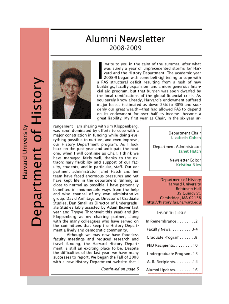 This newsletter outlines the significant events and updates from the Department of History at Harvard University for the academic year 2008-2009, including faculty news, memorials, updates on graduate