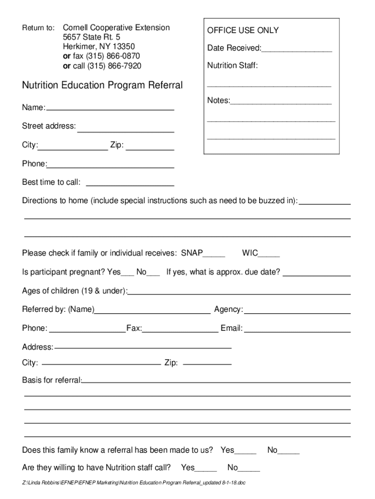 Edit nutrition education program referral. Rearrange and rotate pages, insert new and alter existing texts, add new objects, and take advantage of other helpful tools. Click Done to apply changes and return to your Dashboard. Go to the Documents tab to access merging, splitting, locking, or unlocking functions.