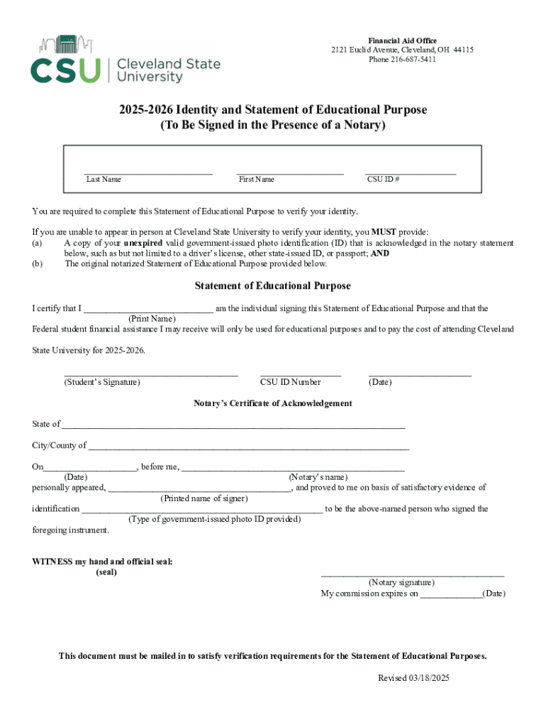 This document must be signed in the presence of a notary to verify the identity of the individual for financial aid purposes at Cleveland State University for the academic year 2025-2026. It includes