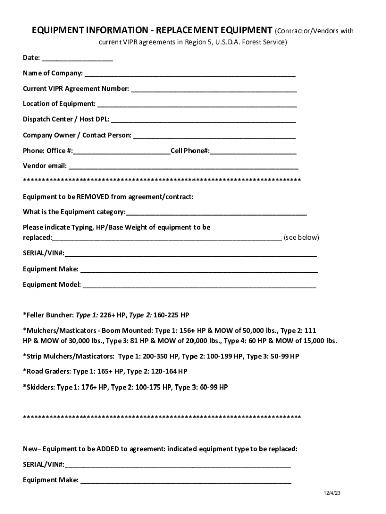 This document outlines the process for replacing miscellaneous heavy equipment under VIPR contracts with the U.S. Forest Service. It includes requirements for equipment eligibility, documentation