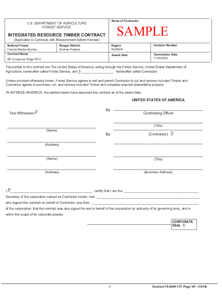 Name of ContractorU.S. DEPARTMENT OF AGRICULTURE FOREST SERVICESAMPLEINTEGRATED RESOURCE TIMBER CONTRACT (Applicable to Contracts with Measurement before Harvest) National Forest Francis MarionSumter