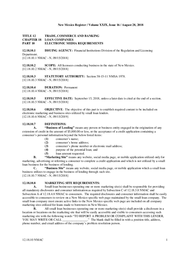 This document outlines the electronic media requirements for small loan lenders in New Mexico, detailing the necessary disclosures and information that must be presented on marketing and business