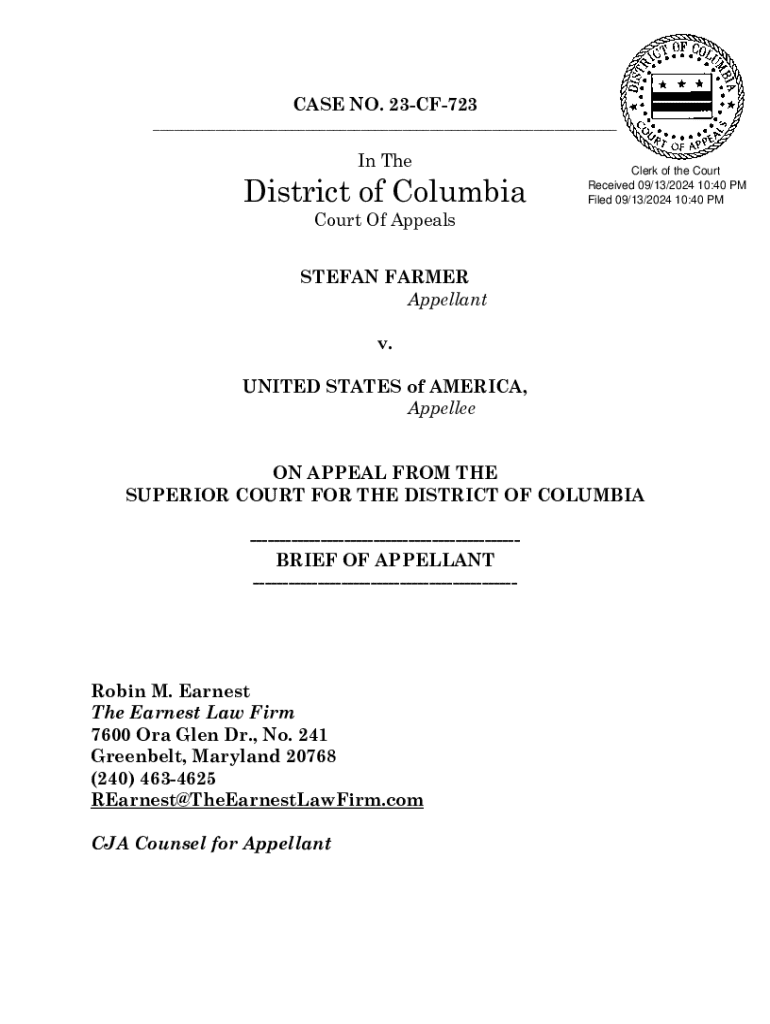This document is a legal brief submitted by the appellant, Stefan Farmer, in the District of Columbia Court of Appeals challenging the trial court\'s decisions regarding the exclusion of expert witness