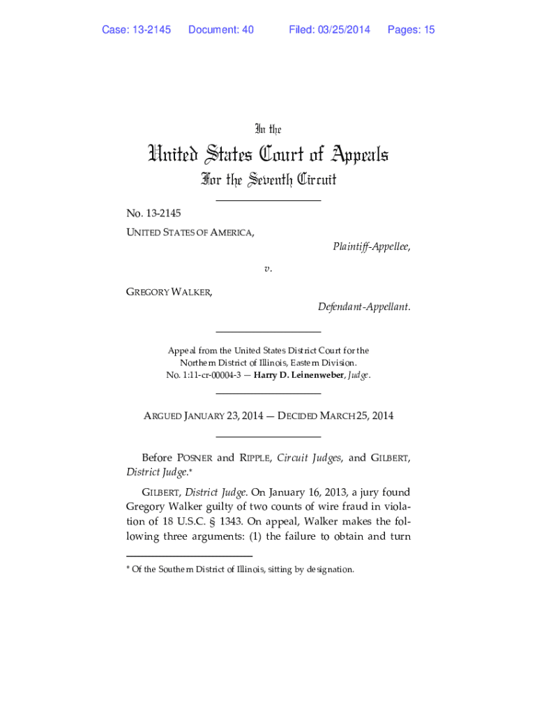 This document is a judgment from the United States Court of Appeals for the Seventh Circuit regarding the case of United States of America v. Gregory Walker, where the defendant was found guilty of