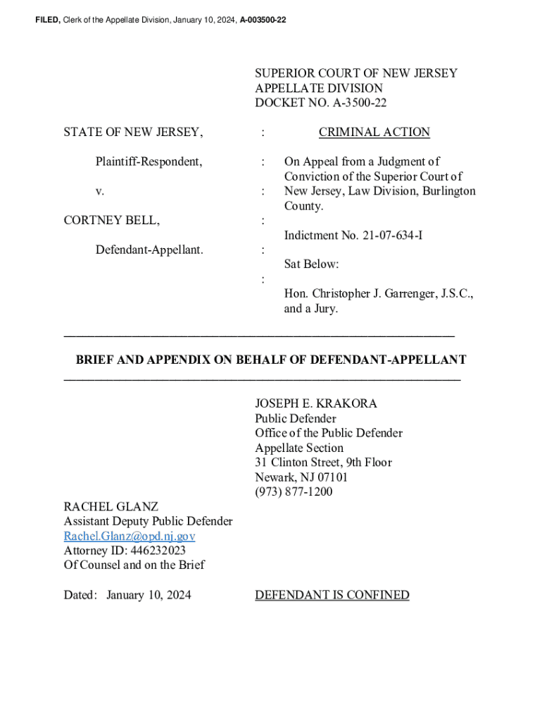 FILED, Clerk of the Appellate Division, January 10, 2024, A00350022SUPERIOR COURT OF NEW JERSEY APPELLATE DIVISION DOCKET NO. A350022 STATE OF NEW JERSEY,:PlaintiffRespondent,:v.:CORTNEY BELL,CRIMINAL