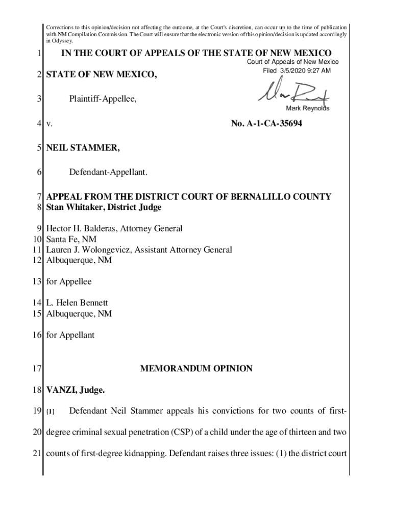 Este documento es una opinión del Tribunal de Apelaciones del Estado de Nuevo México relacionada con la apelación de Neil Stammer, condenado por delitos graves, incluidos la penetración sexual