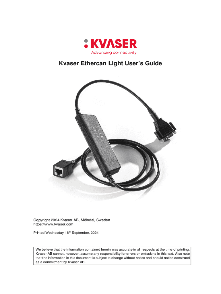 This manual is intended for Kvaser Ethercan Light users. It contains a description of the hardware properties and general instructions for connecting the device to a computer. It provides detailed