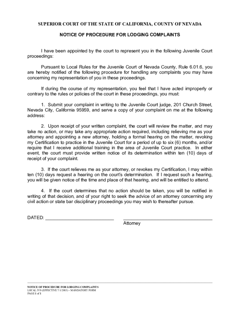 This document outlines the procedure for lodging complaints regarding the representation in Juvenile Court proceedings in Nevada County, California. It details the steps to submit a written complaint,