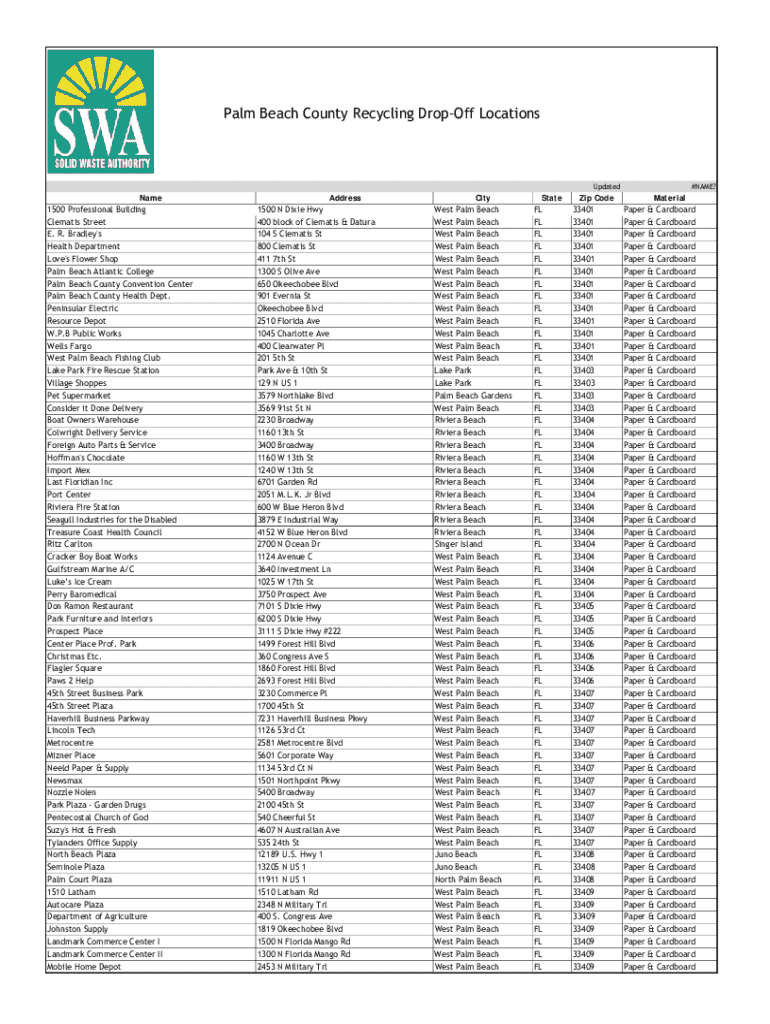 This document provides a list of locations in Palm Beach County where residents can drop off recyclables, specifically focusing on paper and cardboard materials.