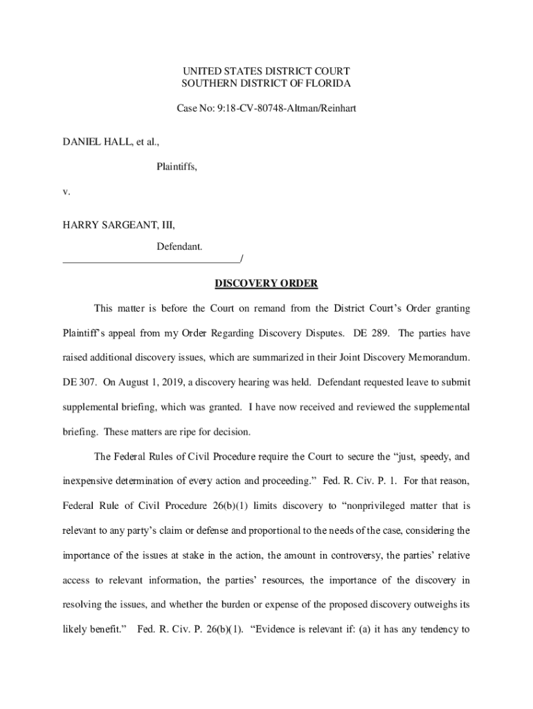 This document outlines the court\'s ruling on discovery disputes between the plaintiffs and defendant in the case of Daniel Hall v. Harry Sargeant, III. It details the procedural history of the case,