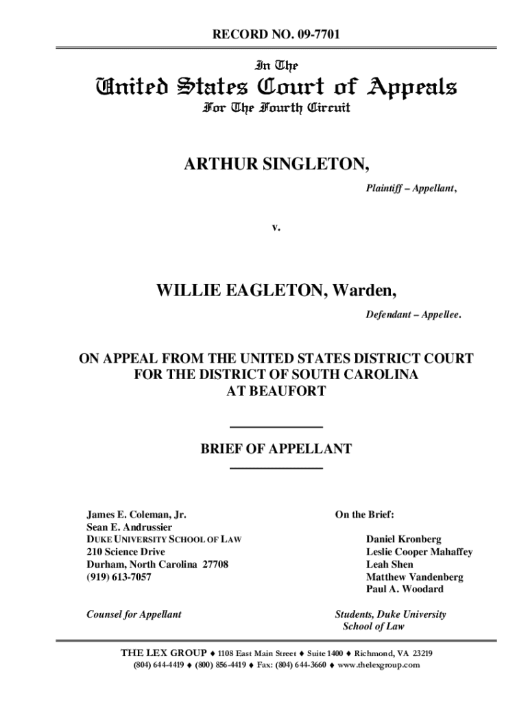 Este documento es un escrito de apelación presentado ante la Corte de Apelaciones de los Estados Unidos para el Cuarto Circuito, donde Arthur Singleton apela su condena debido a la supuesta ineptitud