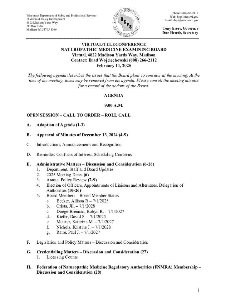 Get the free Naturopathic Medicine Examining Board Meeting Minutes - dsps wi