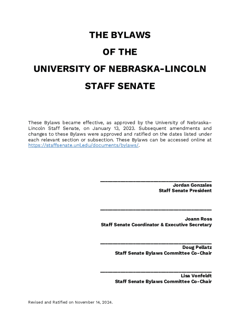 These Bylaws outline the purpose, organization, and procedures governing the Staff Senate at the University of Nebraska-Lincoln, including membership, duties, elections, and amendments to the bylaws.