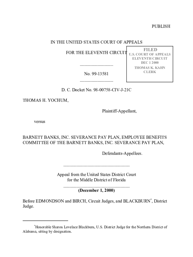 This document is an appellate court decision concerning Thomas H. Yochum\'s appeal against the Barnett Banks, Inc. Severance Pay Plan regarding the denial of severance benefits after he declined an