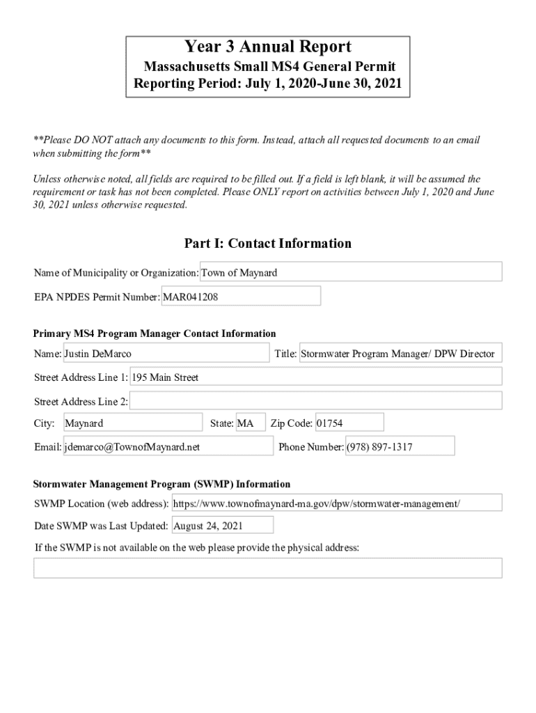 Este informe anual documenta las actividades realizadas por el municipio de Maynard en relación con el Permiso General MS4 de Massachusetts para el periodo de reporte del 1 de julio de 2020 al 30