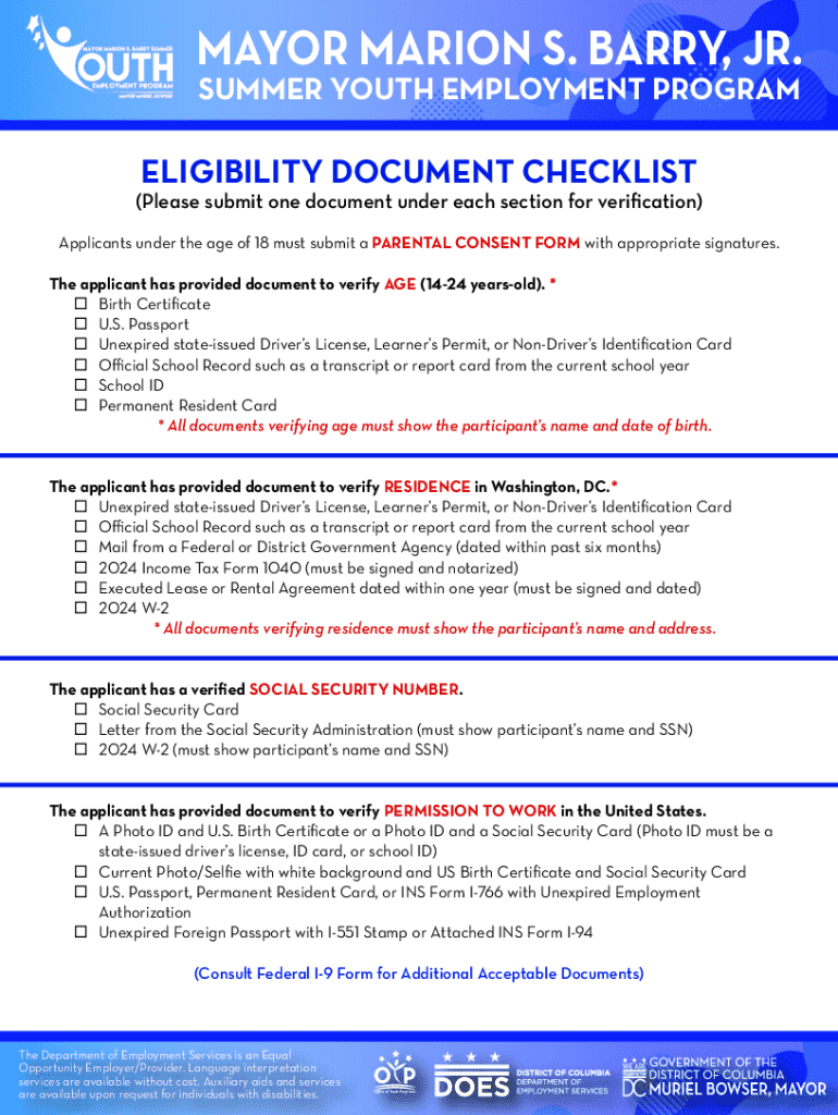 This document serves as a checklist for applicants of the Summer Youth Employment Program to verify their eligibility through various required documents including proof of age, residence, social security