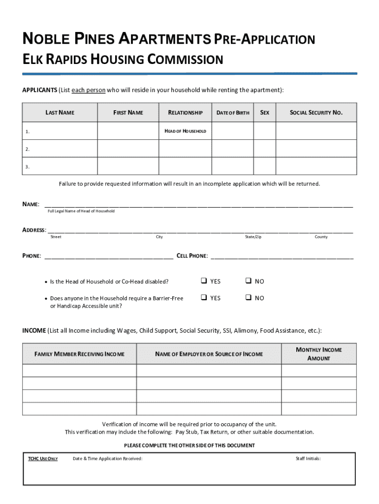 This document serves as a pre-application for renting an apartment at Noble Pines Apartments as managed by the Elk Rapids Housing Commission. It collects information about the applicants, their income,