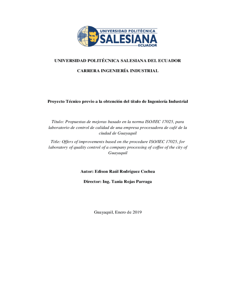 Este documento presenta un proyecto técnico que expone propuestas de mejoras para un laboratorio de control de calidad en una empresa procesadora de café en Guayaquil, basándose en la norma internacional