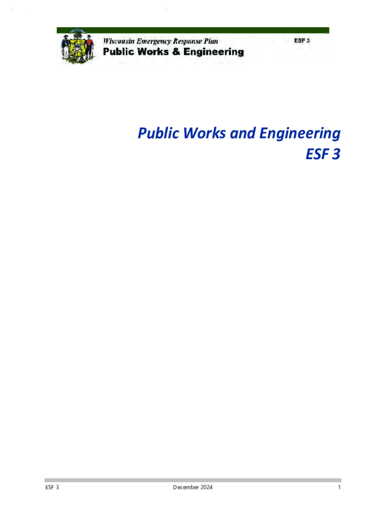 This document outlines the roles and responsibilities of state agencies in responding to public works and engineering emergencies or disasters in Wisconsin. It details coordination efforts, essential