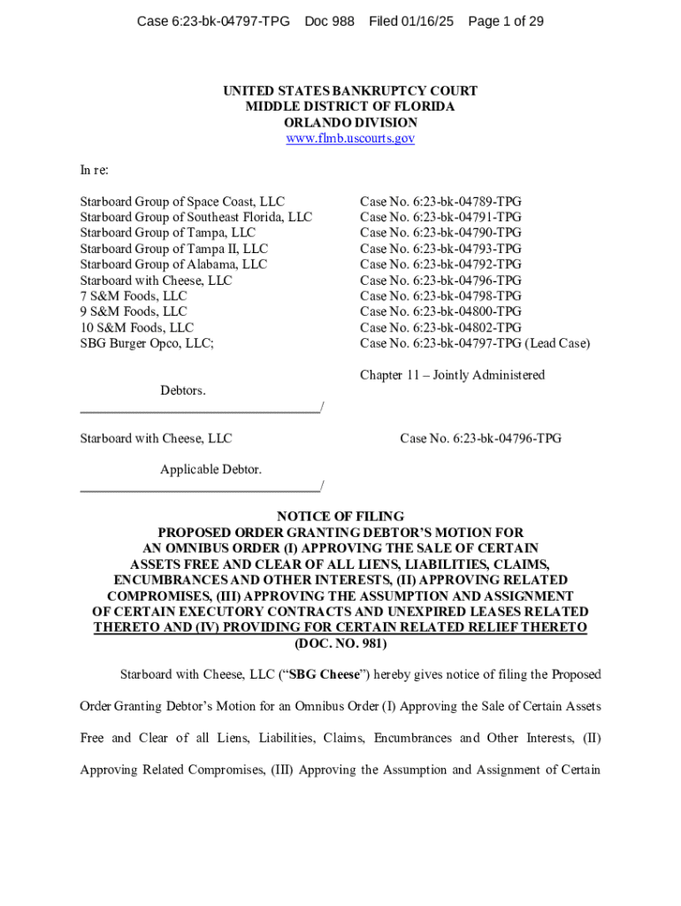 This document is a notice filed in the United States Bankruptcy Court pertaining to the bankruptcy cases of Starboard Group of Space Coast, LLC et al. It details the proposed order for the sale of