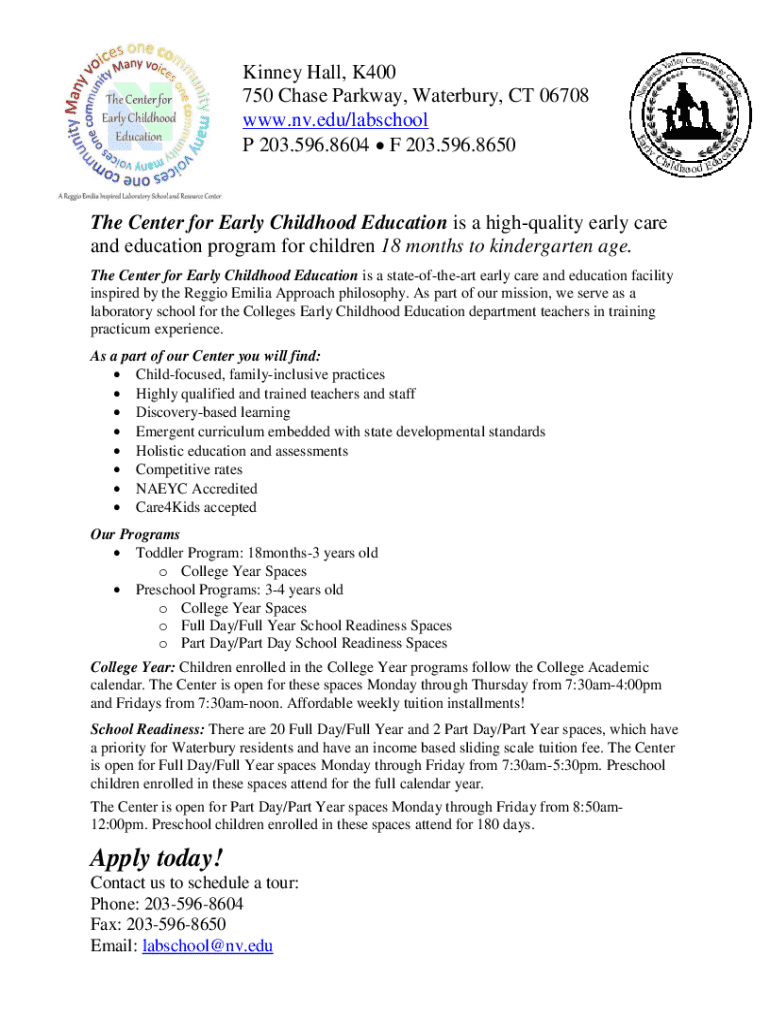 This document serves as an application for enrollment in the Center for Early Childhood Education, detailing the required information for children aged 18 months to kindergarten, including family