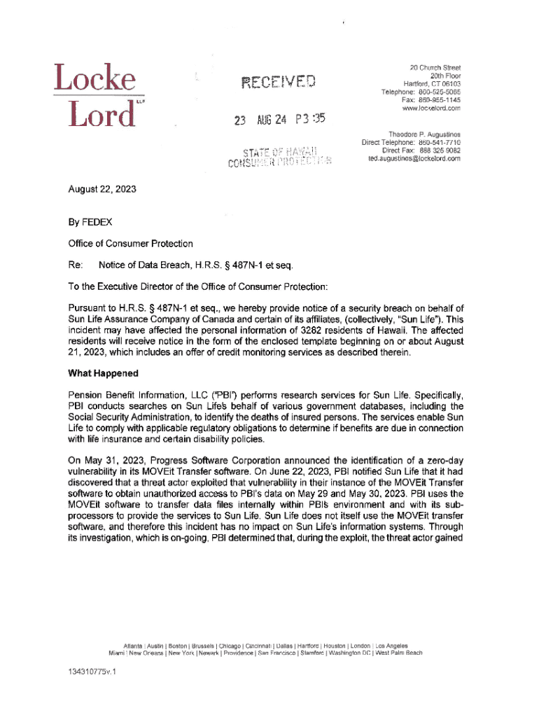 This document serves as a formal notification of a data breach incident that may have compromised personal information of individuals connected to the Sun Life Assurance Company of Canada. It outlines