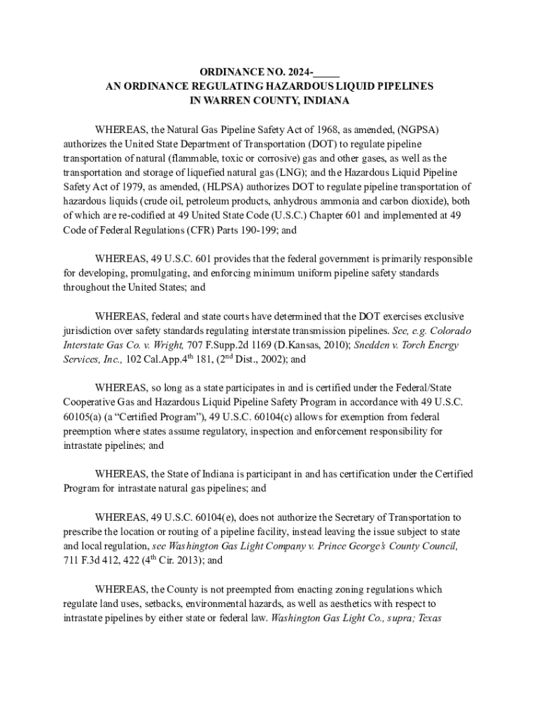 This ordinance regulates the use of land for the transportation of hazardous liquids through hazardous liquid pipelines in Warren County, ensuring compliance with federal and state safety standards