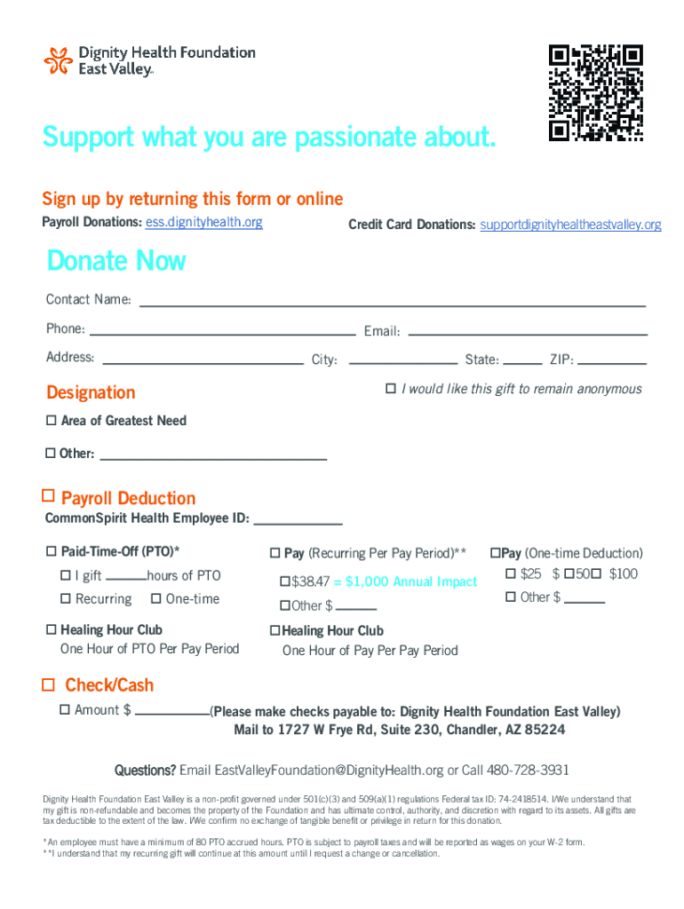 This document serves as a donation form for employees and supporters to contribute to the Dignity Health Foundation East Valley, including options for payroll deductions, one-time donations, and various