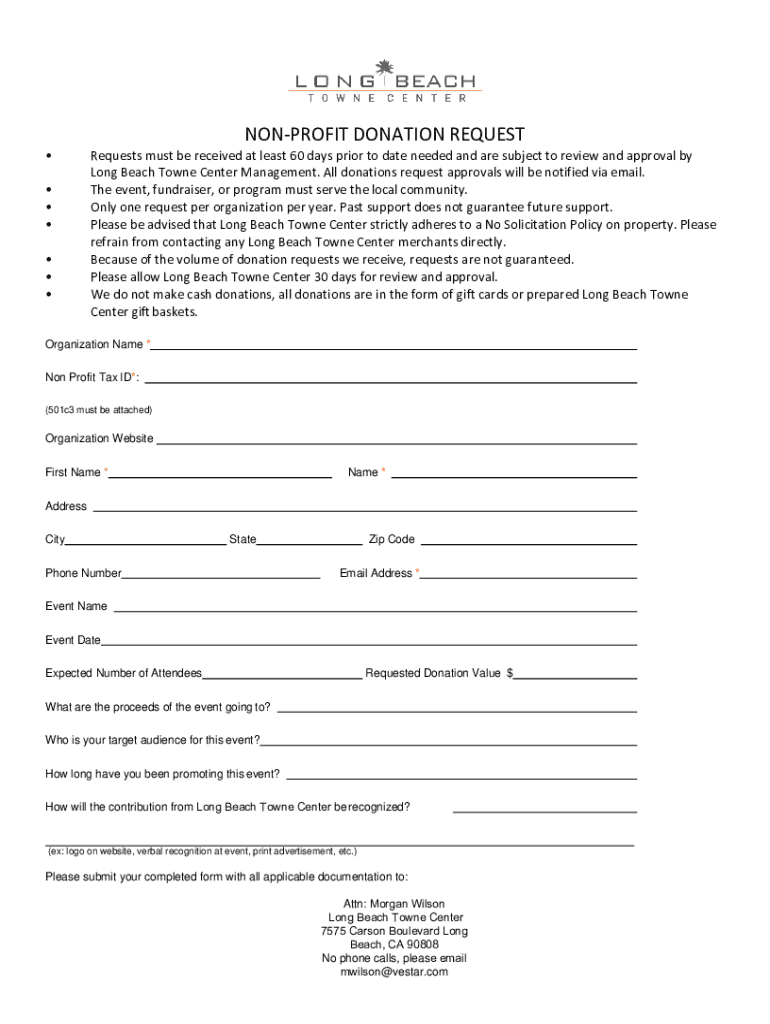 This document facilitates requests for donations from non-profit organizations, specifying requirements for submission, review, and acceptance by Long Beach Towne Center Management.