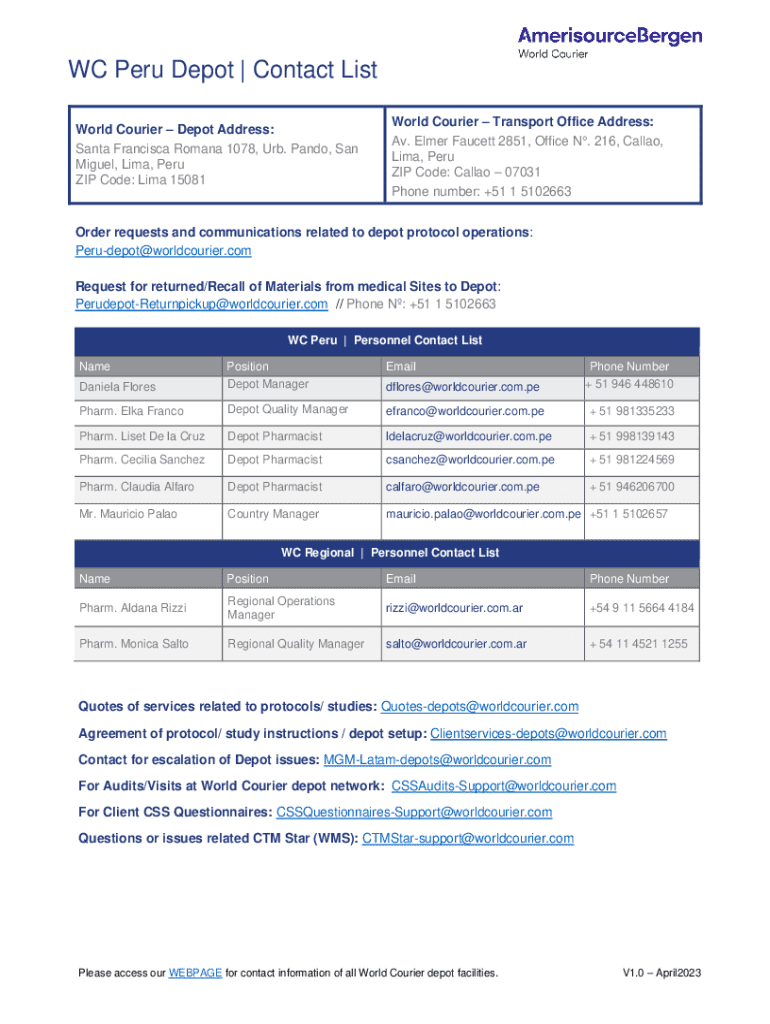 A comprehensive contact list for the World Courier depot in Peru, including addresses, personnel names, positions, email addresses, and phone numbers for various operational contacts.