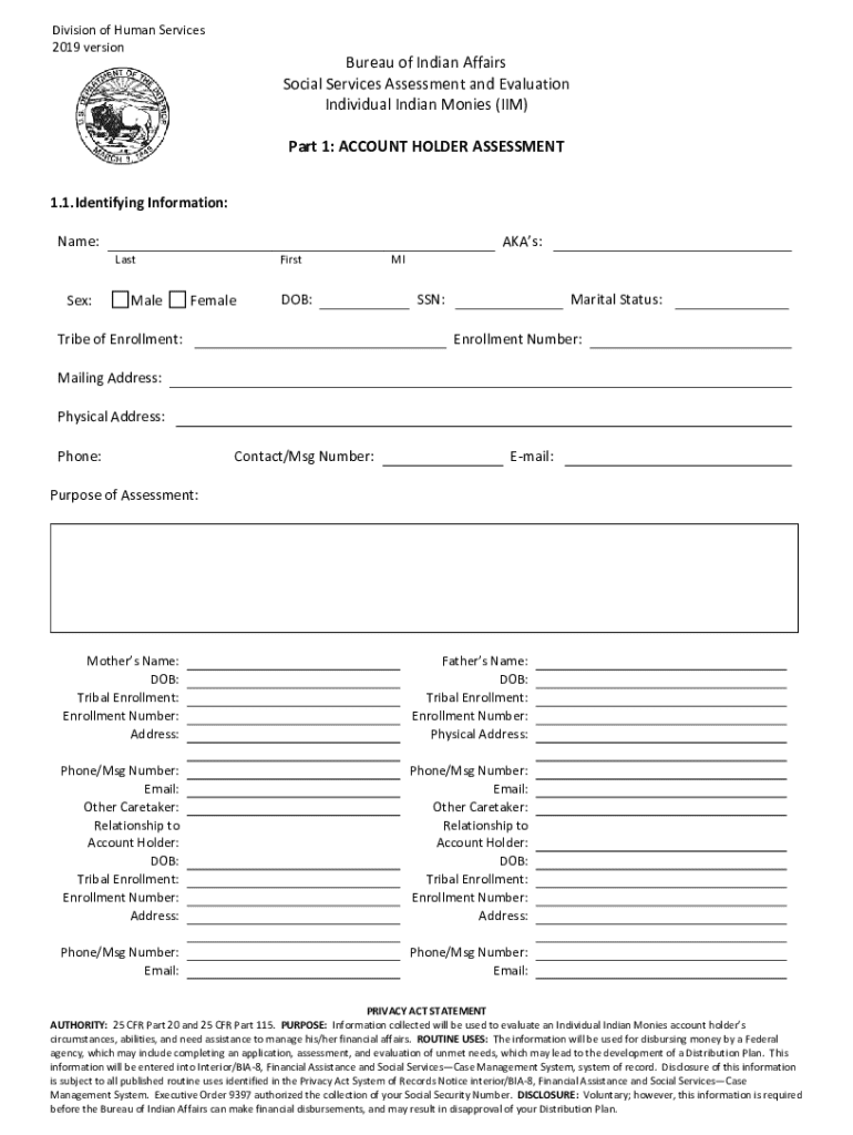 Individuals or families who are seeking assistance from the Bureau of Indian Affairs for social services are typically required to file a BIA social services assessment.