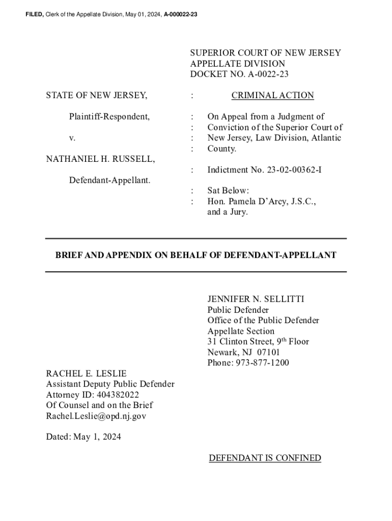 This document is a legal brief submitted to the Appellate Division of the Superior Court of New Jersey, outlining the arguments and legal basis for the appeal of a criminal conviction involving terroristic
