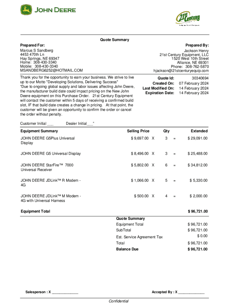 This document outlines a quote provided for the purchase of John Deere equipment, including pricing details, customer information, and terms of sale.