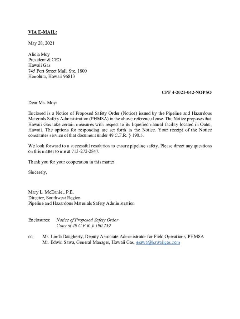 This document serves as a notification from the Pipeline and Hazardous Materials Safety Administration (PHMSA) to Hawaii Gas detailing safety concerns and proposed corrective actions regarding their