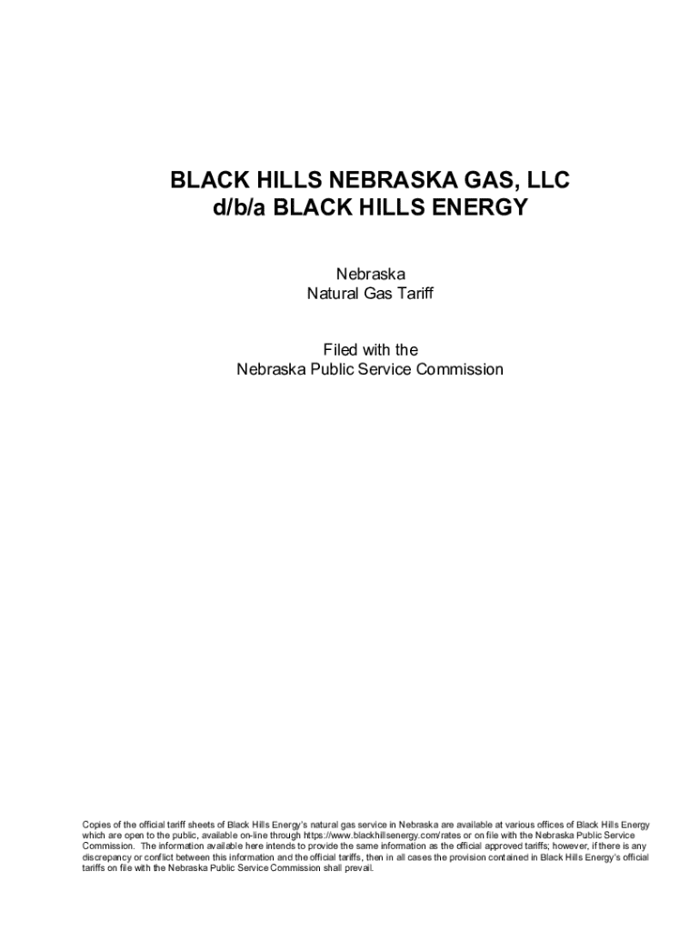 This document outlines the natural gas tariff established by Black Hills Energy for its services in Nebraska, including rules, regulations, and rate schedules applicable to residential and commercial
