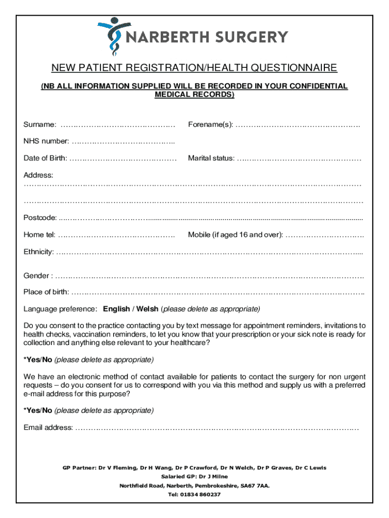 This document serves as a health questionnaire for new patients registering with a medical practice, collecting personal, medical, and demographic information required for patient records.