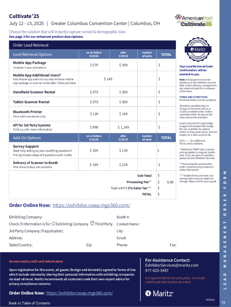 This document serves as a comprehensive guide for exhibitors participating in the Cultivate\'25 trade show, detailing essential information about the event\'s logistics, service providers, deadlines,