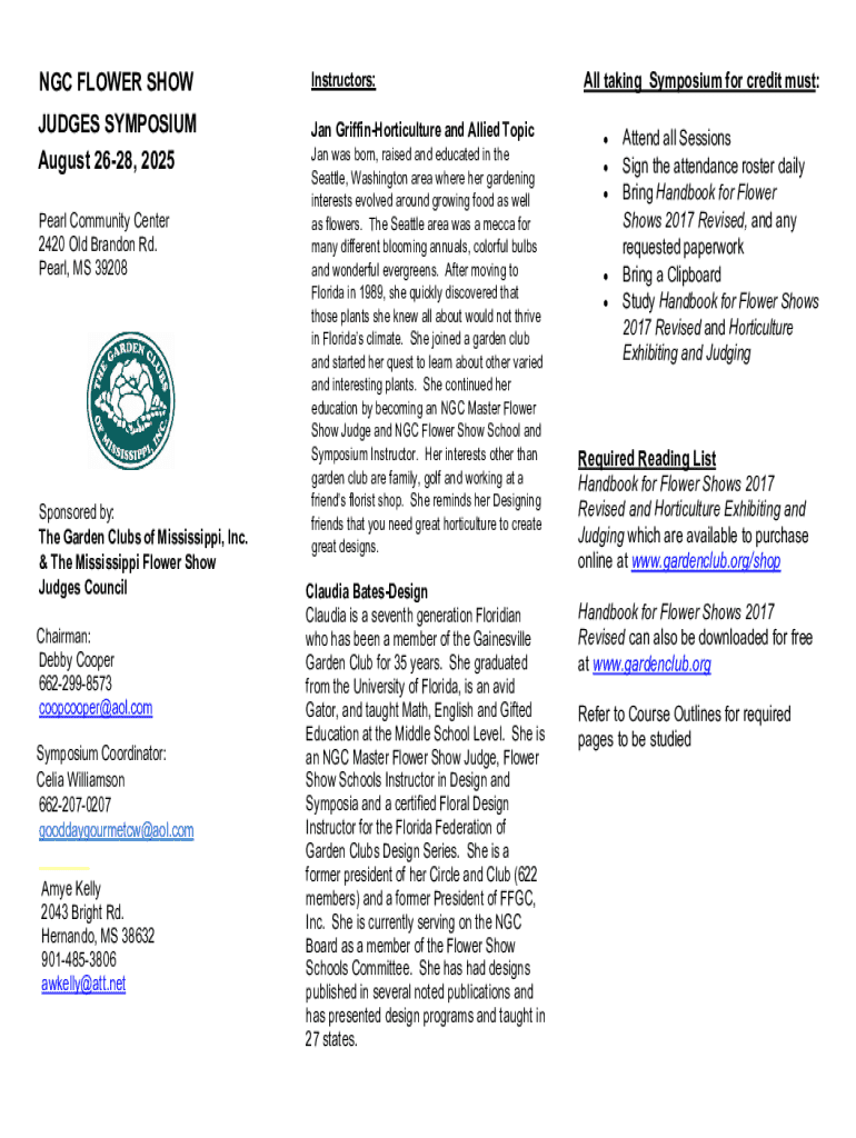 Registration form for the NGC Flower Show Judges Symposium held from August 26-28, 2025, which includes details about the symposium schedule, instructors, and symposium requirements.
