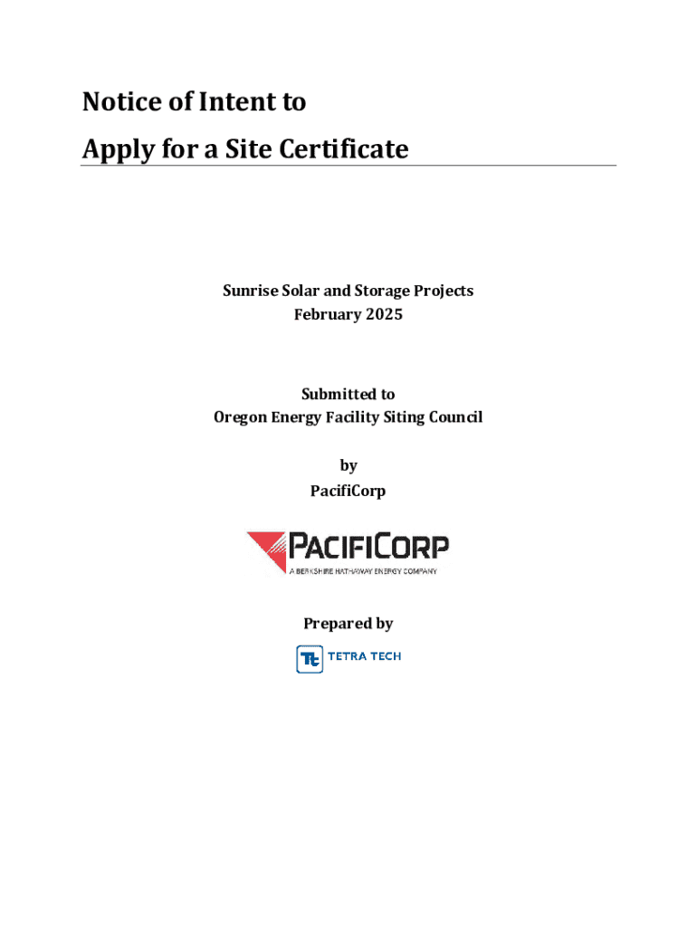 This document serves as a formal notice of intent submitted by PacifiCorp to the Oregon Energy Facility Siting Council to apply for a site certificate for the construction and operation of the Sunrise
