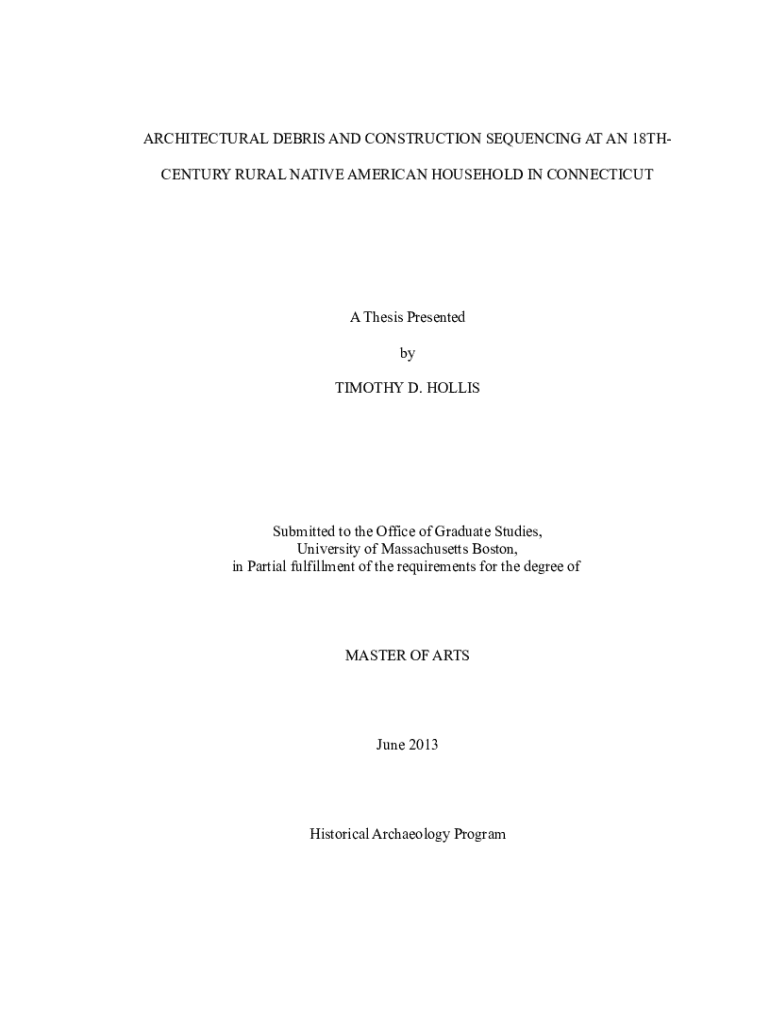 This thesis investigates the archaeological remains of an 18th-century Native American household site on the Eastern Pequot reservation in Connecticut, analyzing spatial and architectural artifacts